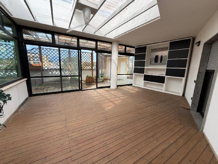 Vi proponiamo una soluzione in stabile di recente costruzione, un elegante attico, con terrazzo panoramico e finiture di pregio, situato in Via dei Longobardi, servito da comodo ascensore e completo di due posti auto. L ingresso, protetto da portone blindato, conduce in un ampio e luminoso soggiorno open space, impreziosito da pavimento in parquet di massello in bambù e dal suggestivo camino Gyrofocus di Dominique Imbert, vero elemento di design. L ambiente è dotato di impianto di aerazione elettrica e predisposizione per una seconda canna fumaria, per eventuale secondo camino o stufa, completa la zona giorno cucina moderna con elettrodomestici di ultima generazione. La zona notte, ben separata, ospita tre camere da letto, tra cui una raffinata suite padronale con cabina armadio e vasca Jacuzzi. Presenti altri tre bagni con porcellanato di prima scelta, dotati di cabina doccia idromassaggio e bagno turco. Fiore all occhiello della proprietà è lo straordinario terrazzo di circa 305 mq, una parte coperta da tettoia in policarbonato su struttura in legno massello, arricchito da fontana in marmo con riciclo dell acqua, impianto di irrigazione con pompa elettrica, argano elettrico per il sollevamento materiali istallato per sollevare legna per il camino, cucina esterna completa di elettrodomestici di alta gamma e forno a legna, inoltre due pratiche cantine di 8 mq. e un ulteriore area esclusiva a servizio dell’appartamento. Altri comfort che caratterizzano la soluzione sono, impianto di climatizzazione con termoconvettori, sistema antifurto elettronico di ultima generazione, videocitofono con comando telefonico, infissi in legno-alluminio a triplo taglio termico con vetri isolanti, impianto di filodiffusione in tutti gli ambienti, aspirapolvere centralizzato con serbatoio esterno. Una soluzione unica e ideale, per chi desidera vivere in città vicino a tutti i servizi, in un contesto esclusivo, con ampi spazi interni ed esterni e dotazioni di alto livello.